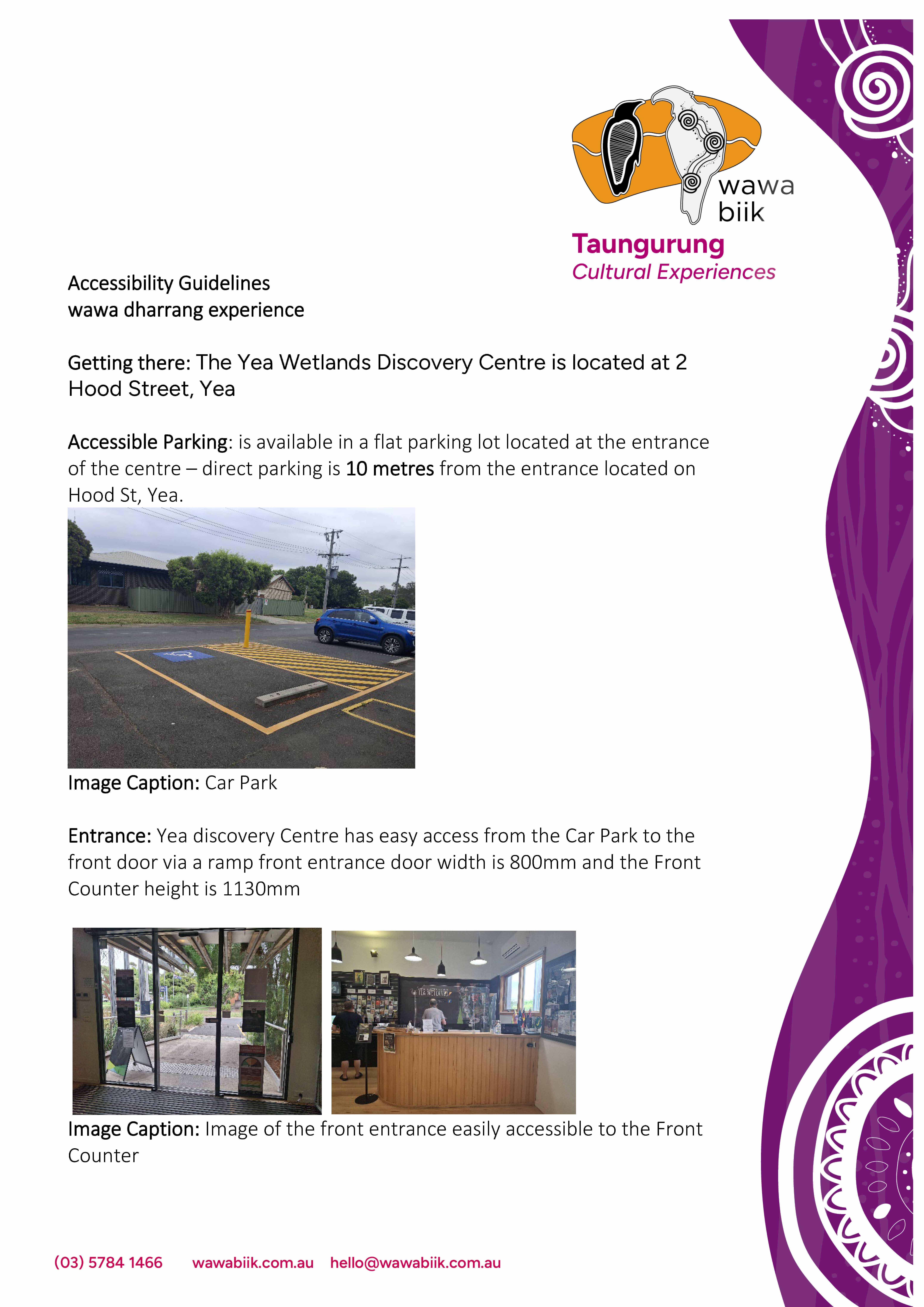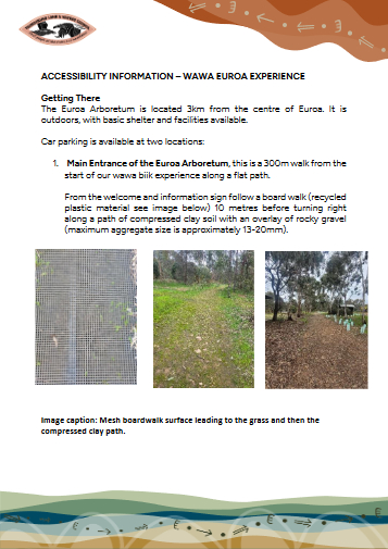 We are committed to shaping our cultural experiences to be as accessible to as many people as possible. The following details outline the access and facilities during a wawa biik experience and partner venues on Country. Please contact us with specific questions related to accessibility.